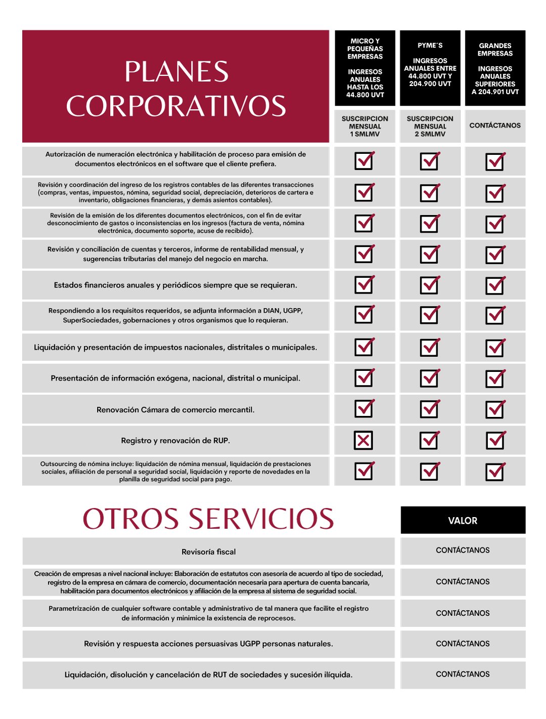 Nuestros planes se basan en una suscripción mensual que incluye servicios contables, tributarios y empresariales, definidos según el volumen de operaciones, número de empleados y tipo de obligaciones de cada empresa. Te asignamos un equipo que te acompaña de forma continua, asegurando orden financiero, cumplimiento legal y soporte oportuno.